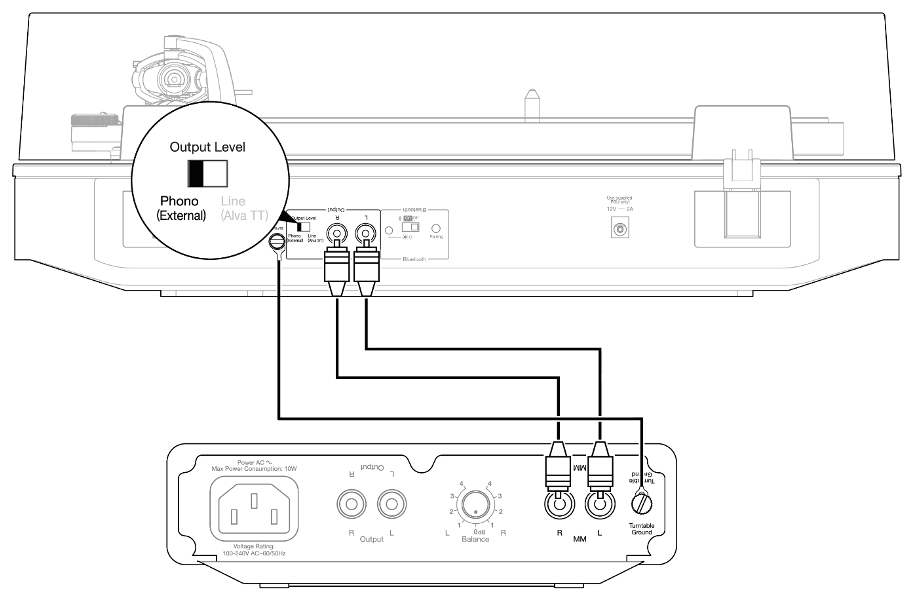 1. Connect the outputs of your turntable to the MM input sockets on the Alva Solo using a high-quality RCA interconnect.