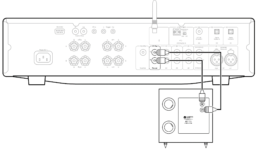 2. Using high quality interconnects, connect the SX-120 subwoofer line-input to either the sub-out, or pre-out of your amplifier or receiver