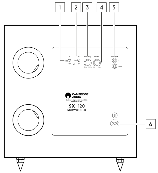 5. Adjust the crossover frequency (3), phase settings (1), and volume (4) to suit your setup