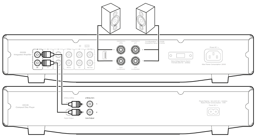 The line outputs are for connecting to the line level inputs on an amplifier. The diagram shows a connection to an amplifier.