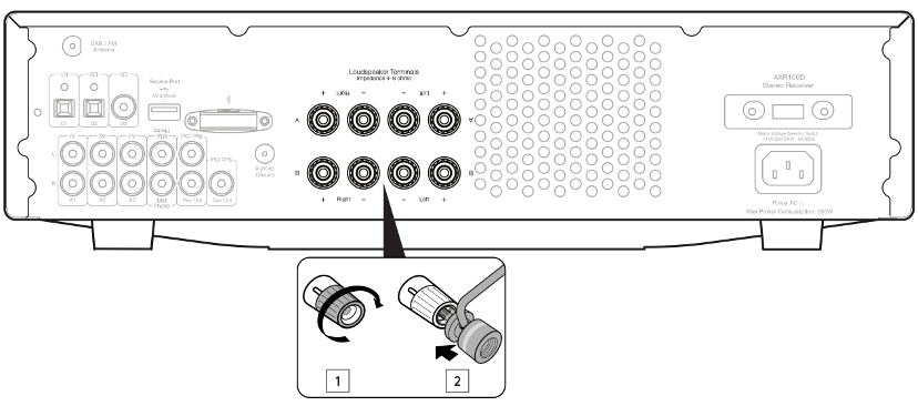 - When using a banana plug, make sure the speaker terminals are completely tightened before inserting the plug.