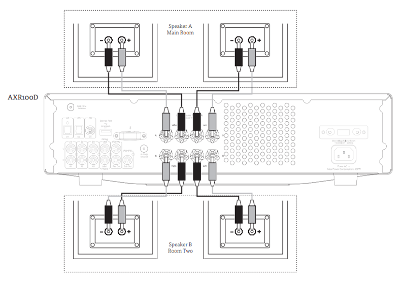 The Speaker A/B button on the front panel and remote control allows the two sets of speakers to be toggled on and off.