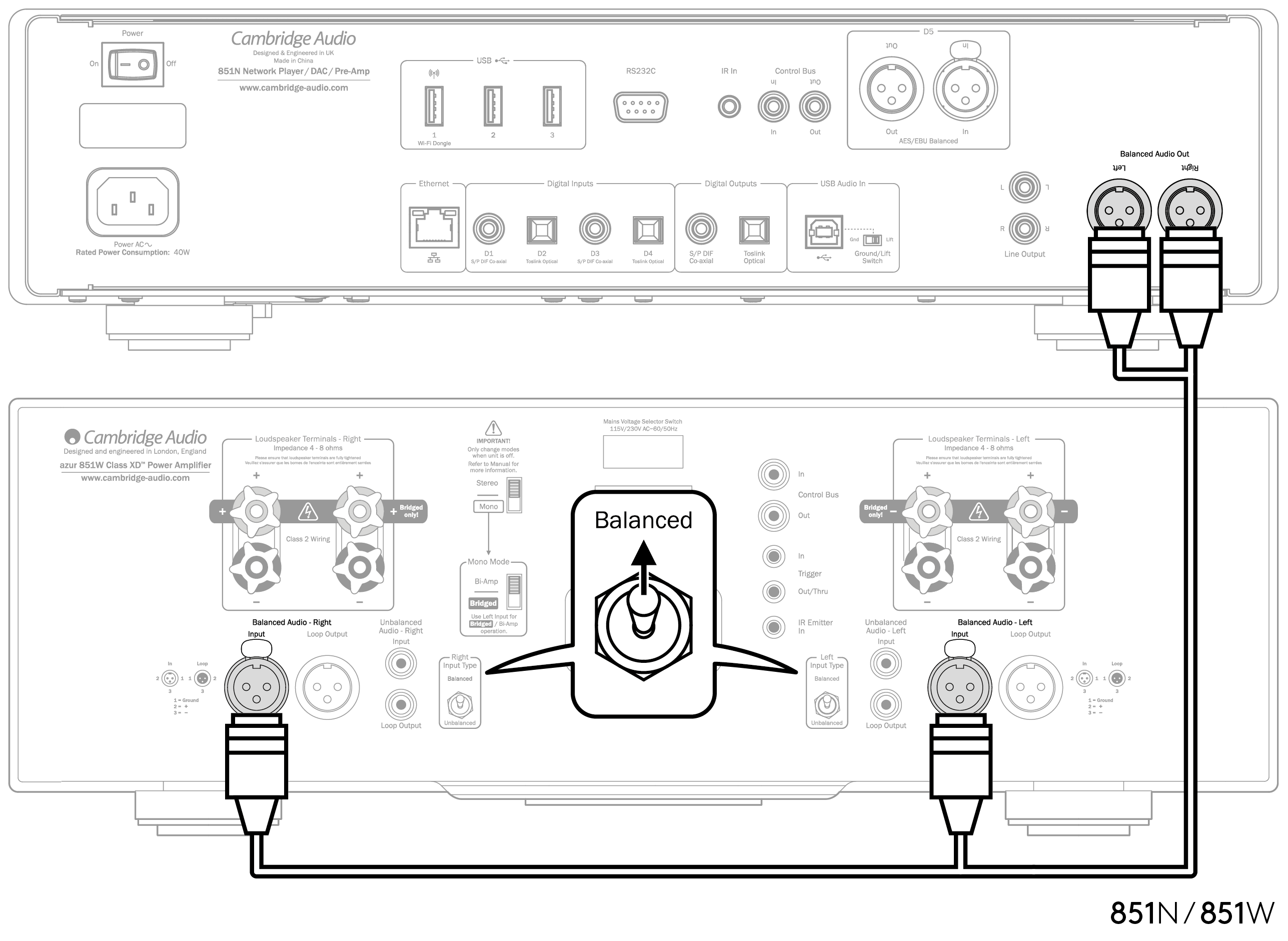If using XLR cables, please ensure to select the ‘Balanced’ switch on your 851W.