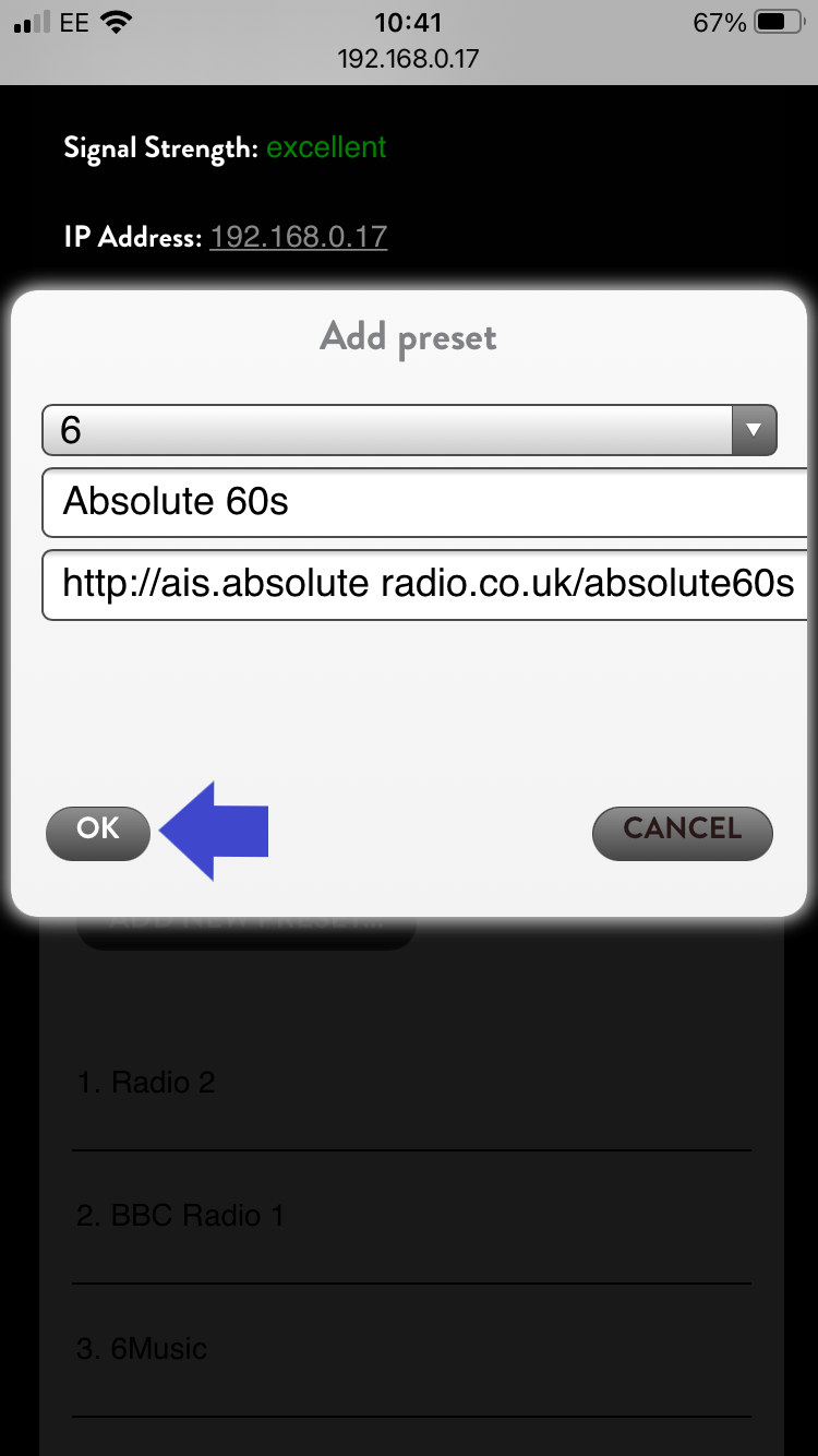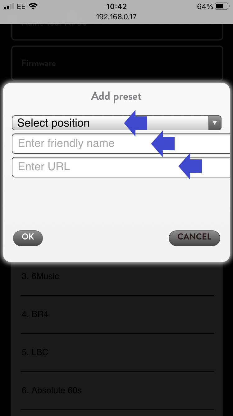 5. Fill out the three fields, first confirming which preset you wish to assign the station to, the preset name, and the station's custom URL. This can usually be found on the station's website.