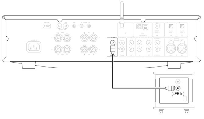 The Preamp Out sockets are for connecting to the input sockets of a power amplifier or active subwoofer. The diagram below shows how to connect the amplifier to an active subwoofer via the Line In inputs on the subwoofer.