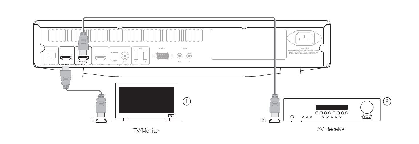 Use an HDMI cable to connect the HDMI OUT (Main) output to your TV, and another HDMI cable to connect the HDMI OUT (Audio Only) output to your receiver.