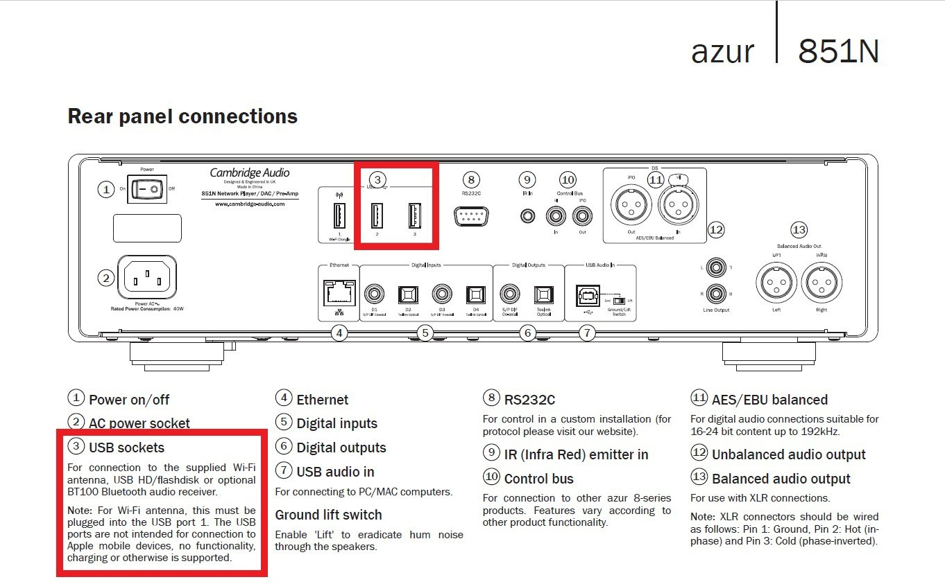 (Please note: The optional Cambridge Audio BT100 Bluetooth dongle can be connected to any available USB socket.)