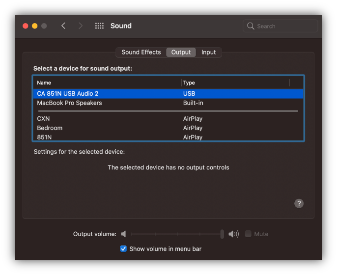 Select the CA 851N Audio Class 1 / 2 as the output sound device.