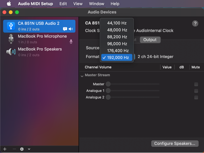 Select the CA 851N Audio Class 1 / 2 as the output sound device on the left column, and then using the drop-down options select the desired bit depth and sample rate preference.