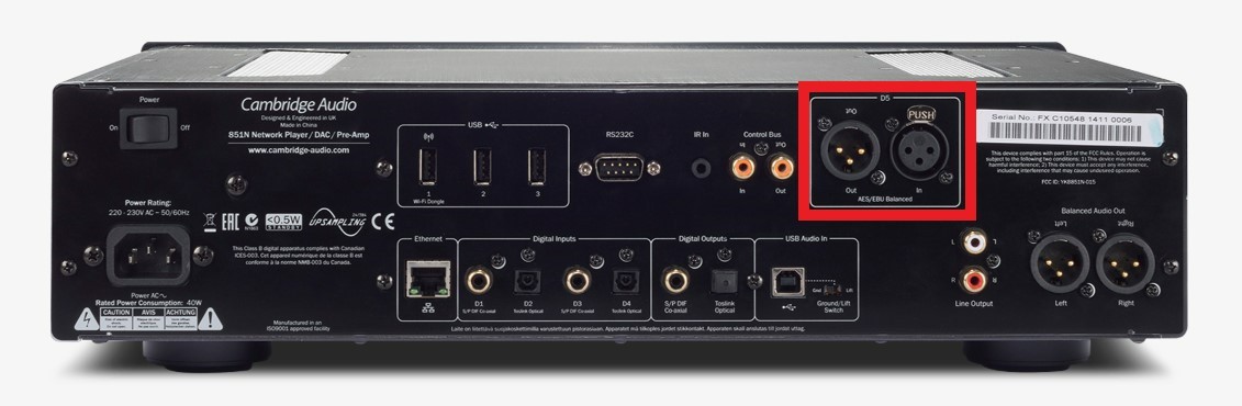 The 851N AES/EBU terminals use an XLR connection but the type of cable used differs from standard audio cable.
