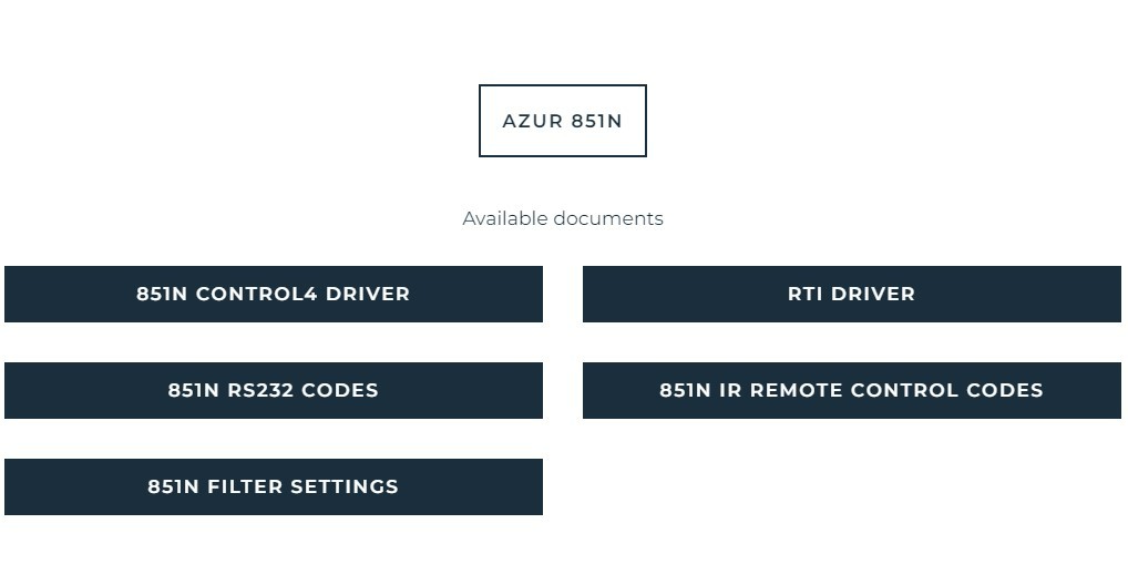 Where can I find useful documents such as 851N CONTROL4 DRIVER, RTI DRIVER, 851N RS232 CODES, 851N IR REMOTE CONTROL CODES, 851N FILTER SETTINGS ? April 04, 2024 14:52 Please use the following link to the Driver Updates web page then scroll down to find:AZUR 851NAvailable documents Driver Updates Related articles Azur 851N Manual What is the latest firmware version for the 851N? Azur 851C - RS232 Codes How do I connect my unit manually using the IP address? How do I connect my Windows PC/Laptop to the EDGE A?