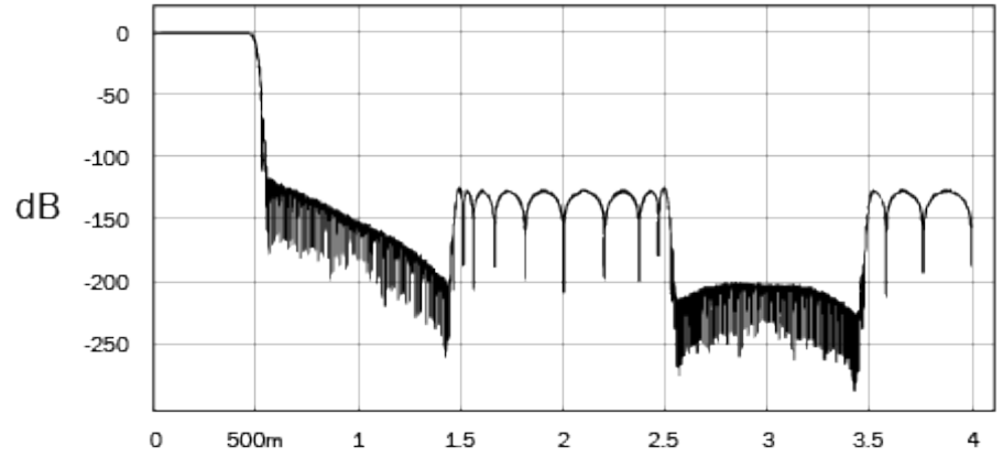 The Short Delay (minimum phase) filter is another highly regarded audio filter that offers even lower ripple in the pass and stop bands. Unlike the 16 Linear Phase filter, group delay is not constant; however, phase shift is low and the particular benefit with this filter is that the impulse response exhibits no pre-ringing.