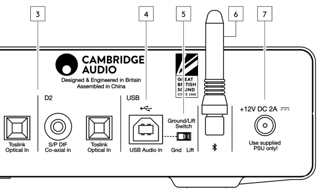Note: Class 2 USB Audio only. Windows-based PCs require a Cambridge Audio USB driver to be installed before connection - Ground/Lift Switch