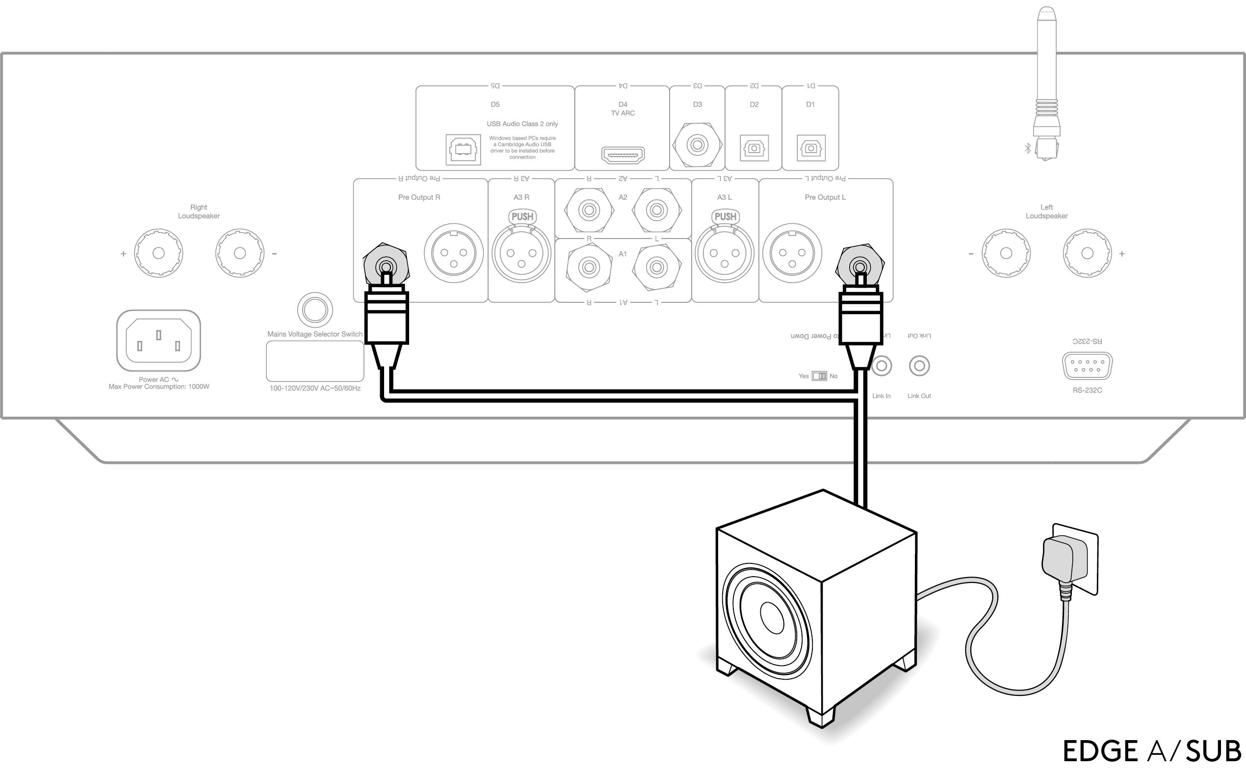 Although the EDGE A does not contain a dedicated subwoofer output, you can connect a subwoofer by connecting either of the unbalanced RCA Pre-Outputs to the corresponding inputs on the rear of your powered sub.