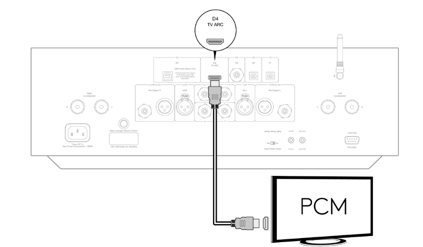 The TV ARC input is labelled as D4 on the front panel source selector.