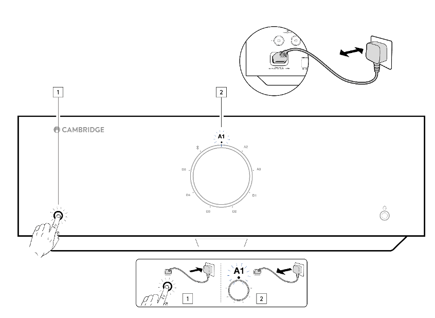 1. Press and hold the power button on the front of the EDGE A whilst plugging the power cable into the unit.