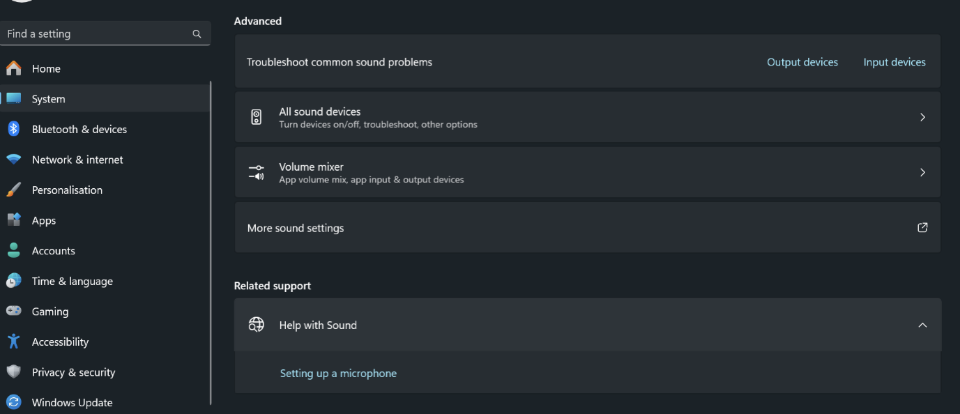 5. Within this same window under Related Settings on the right-hand side, select Sound Control Panel. Alternatively, scroll down and select More Sound Settings.