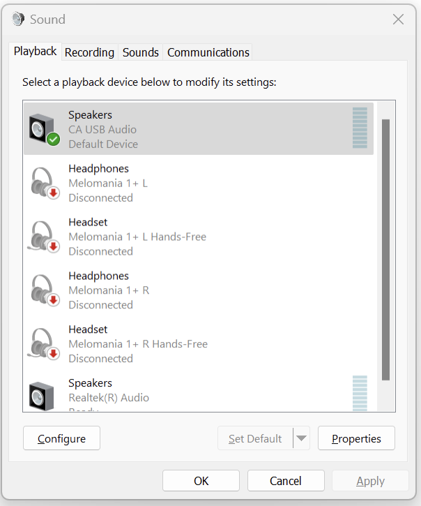 6. On the Playback tab, ensure that the device is the default output device, then select Properties.