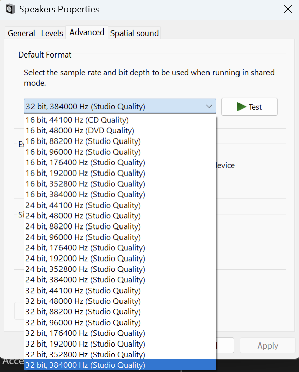 7. Within Speaker Properties, navigate to the Advanced tab. Select the desired bit depth and sample rate preference. (This step is optional.)