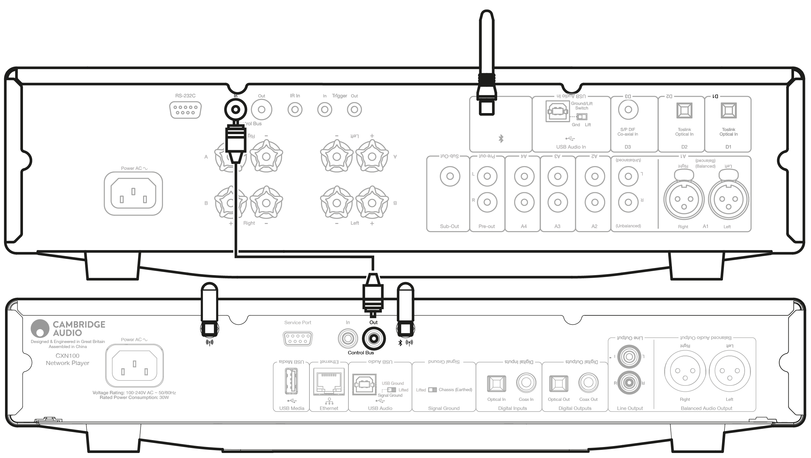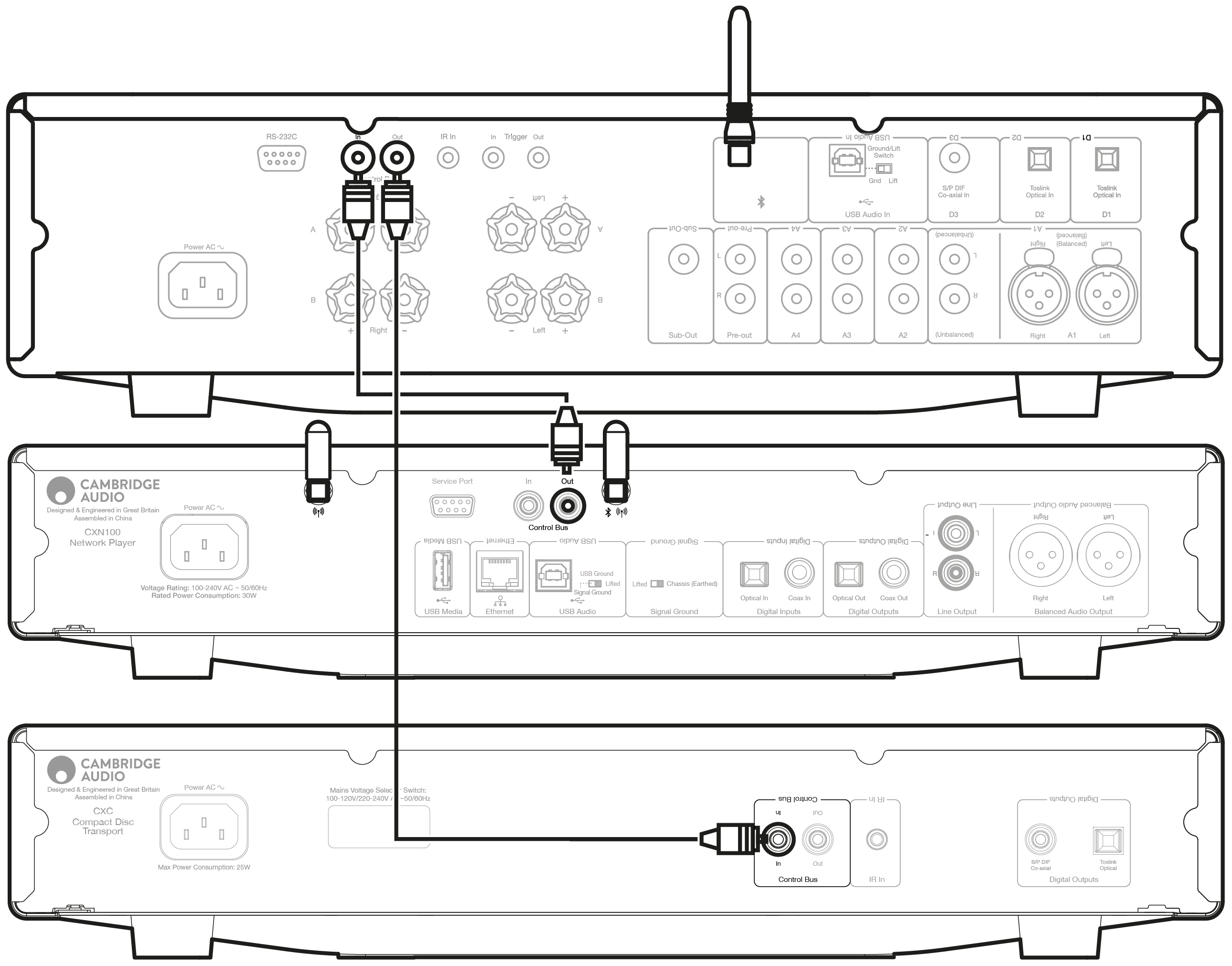 With all three CX devices, connect the CXN100 Control Bus out to CXA Control Bus in. Then connect the CXA Control Bus out to CXC Control Bus in.