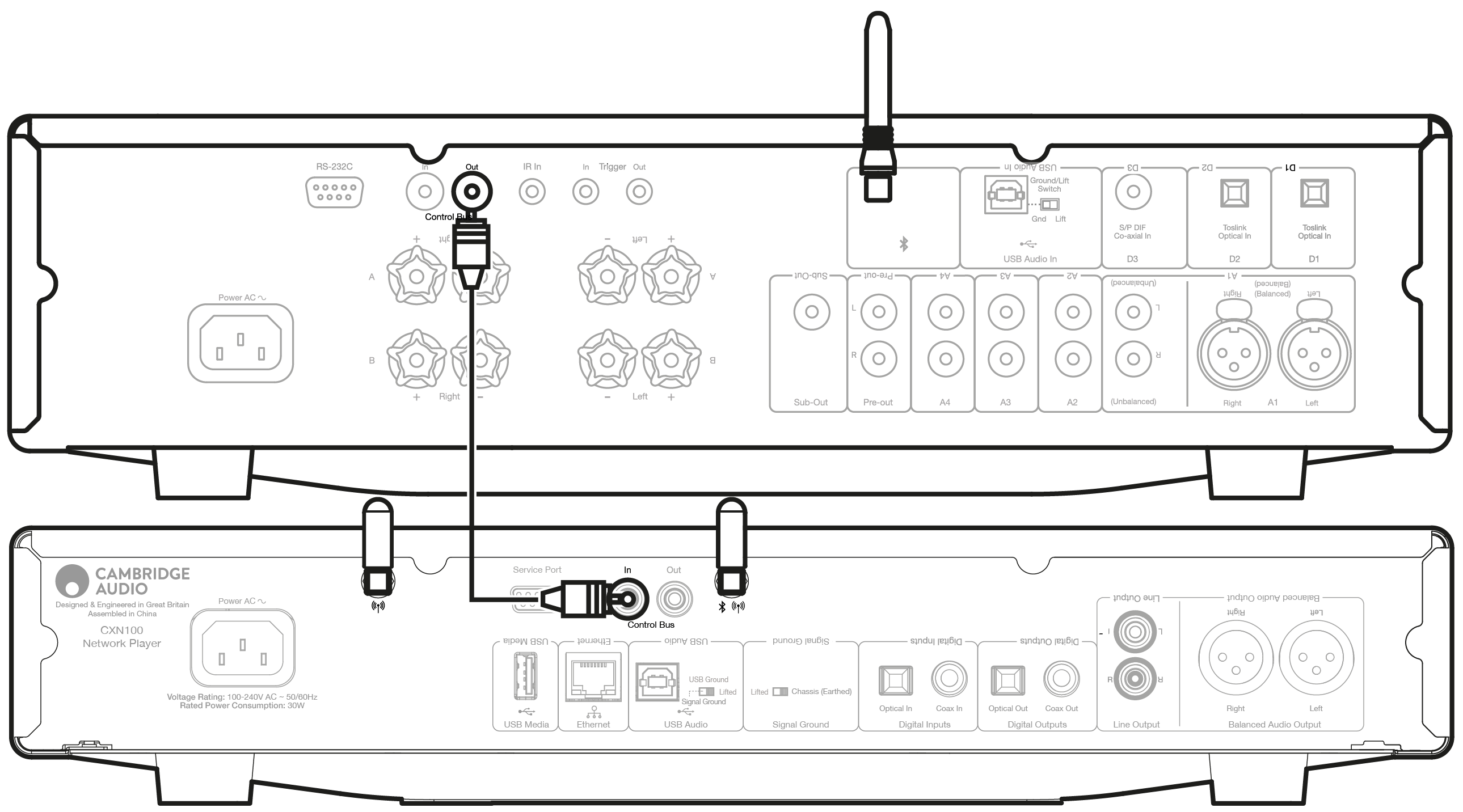 When using the app to turn the CXN100 on/off, this will also turn the CXA on/off. The app can also be used to control the volume of the CXA. Connect the CXN100 Control Bus Out to the CXA Control Bus In.