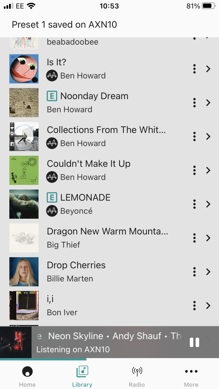 1. Sign in to TIDAL/Deezer/Qobuz in the 'Library' section of the StreamMagic app, and then find the album, playlist or song you want to add as a preset.