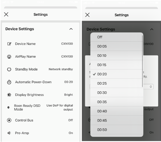 The CXN100 will automatically switch to standby mode after 20 minutes of inactivity. This Automatic Power-Down (APD) feature can be disabled, by navigating to the device settings within the StreamMagic app.
