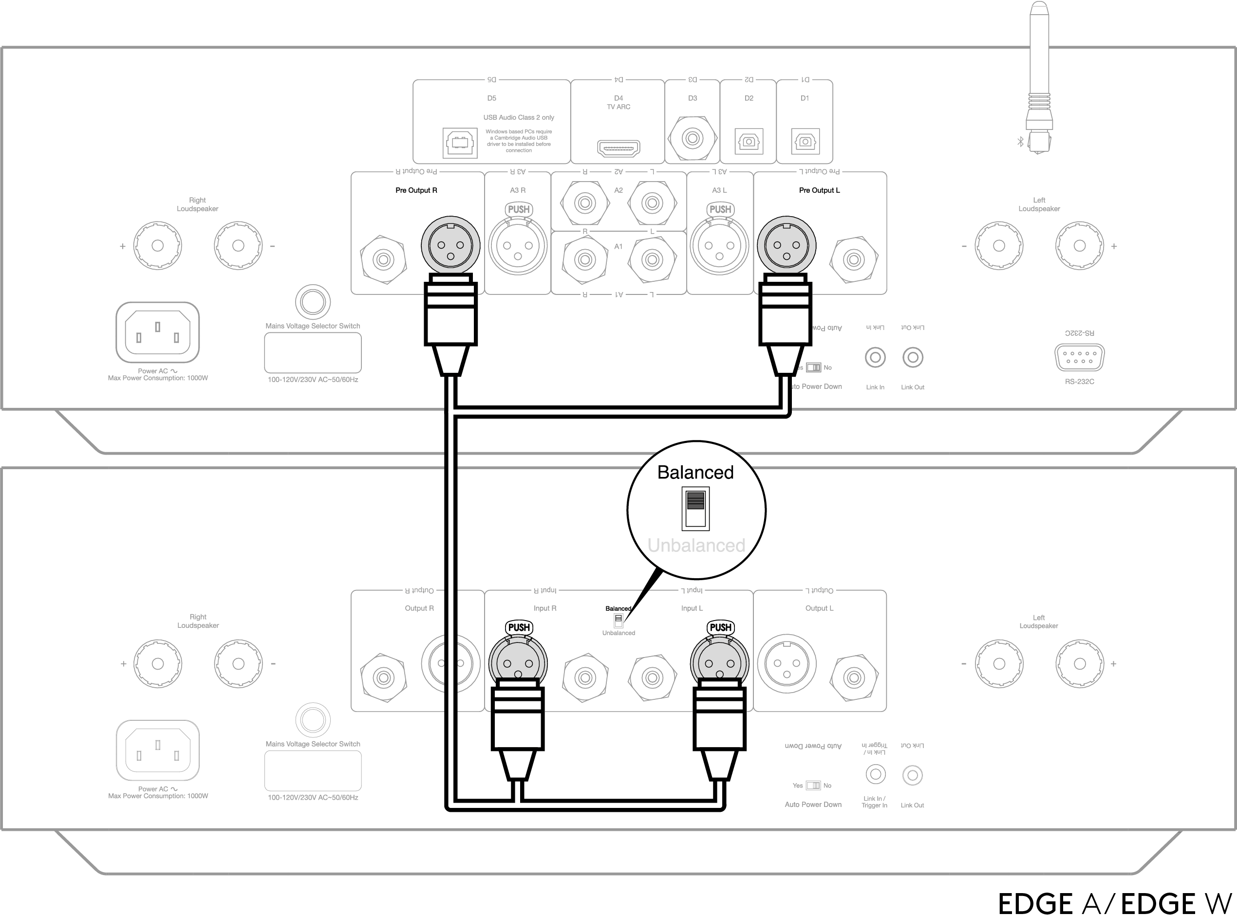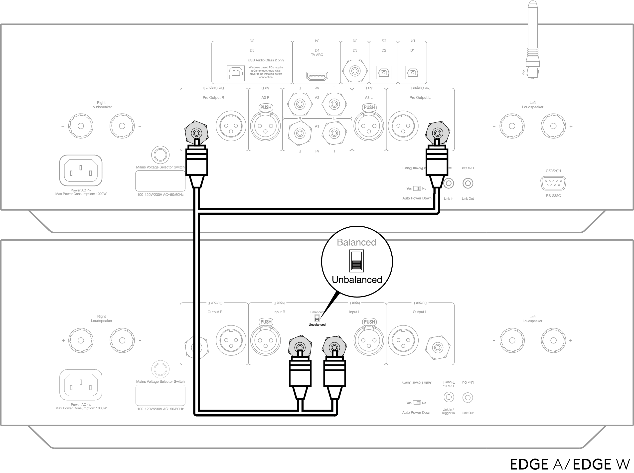 To connect your EDGE A to your EDGE W you will need to run either unbalanced RCA cables or balanced XLR cables from the Pre Outs to the input on the EDGE W.