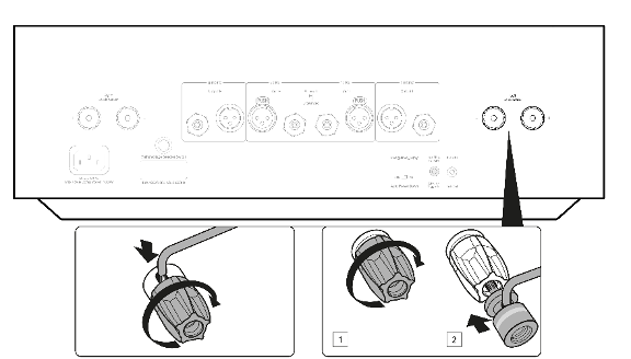 Note: When using a banana plug, make sure the speaker terminals are completely tightened before inserting the plug.