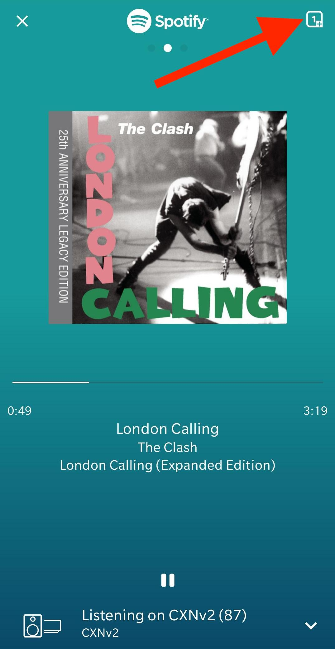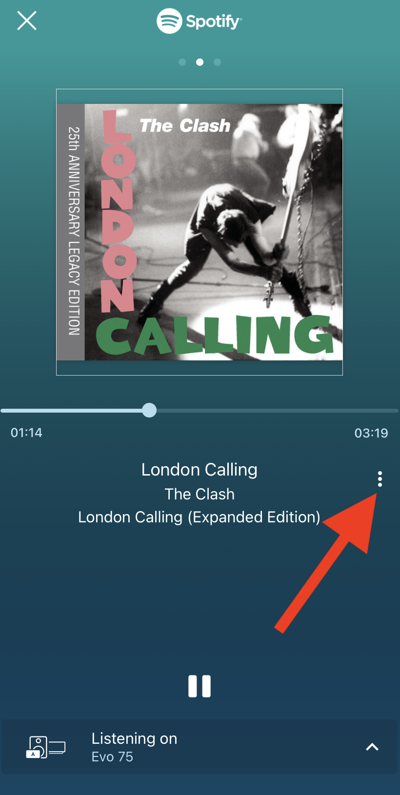 1. Stream a playlist, album or song to your Network Player via the Spotify app, then return to the playing screen on the app and press the three vertical ellipsis dots if using an iPhone as shown.
