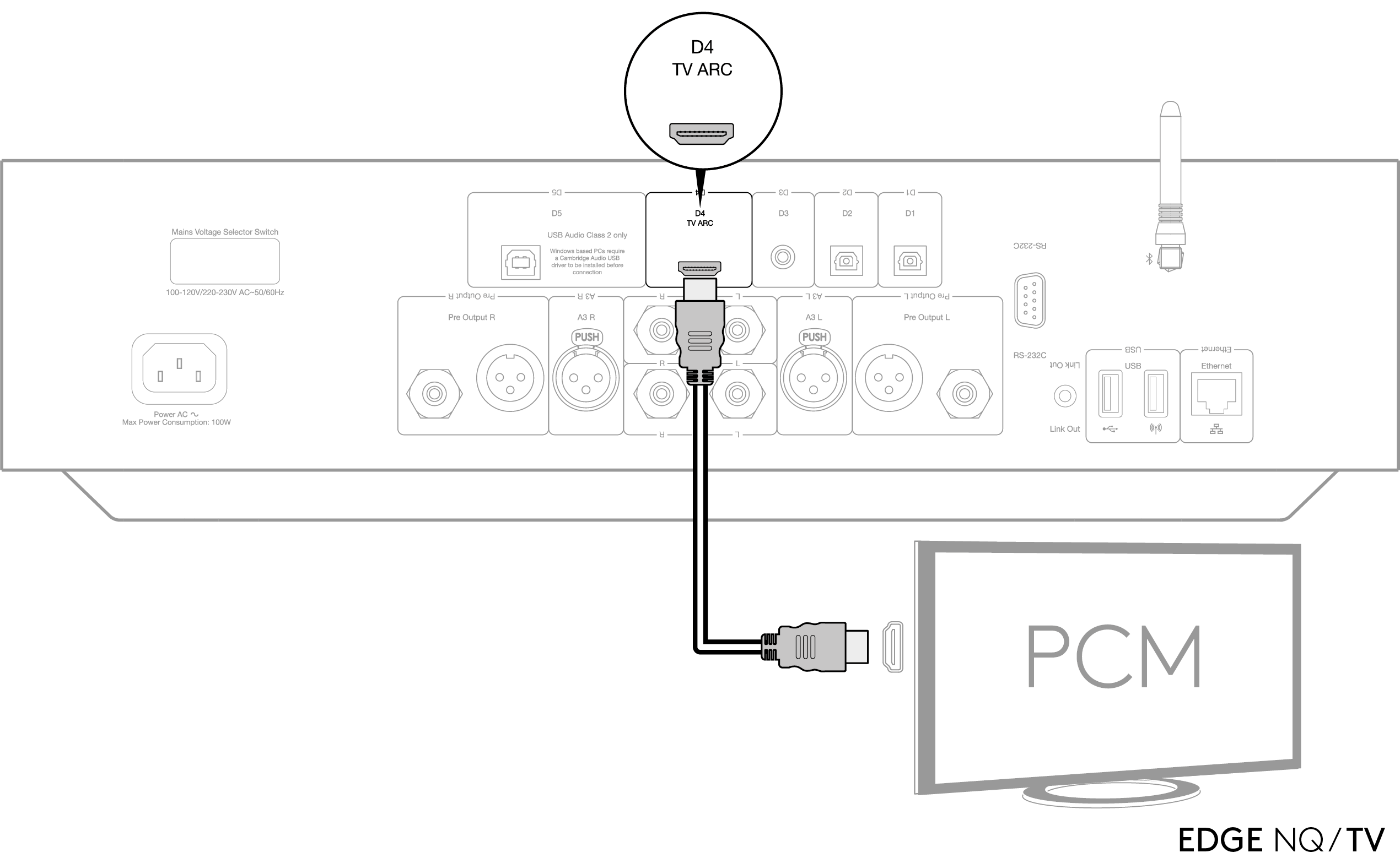 The Edge NQ has an HDMI ARC (Audio Return Channel) input to allow you to create a connection to a TV that supports ARC function.