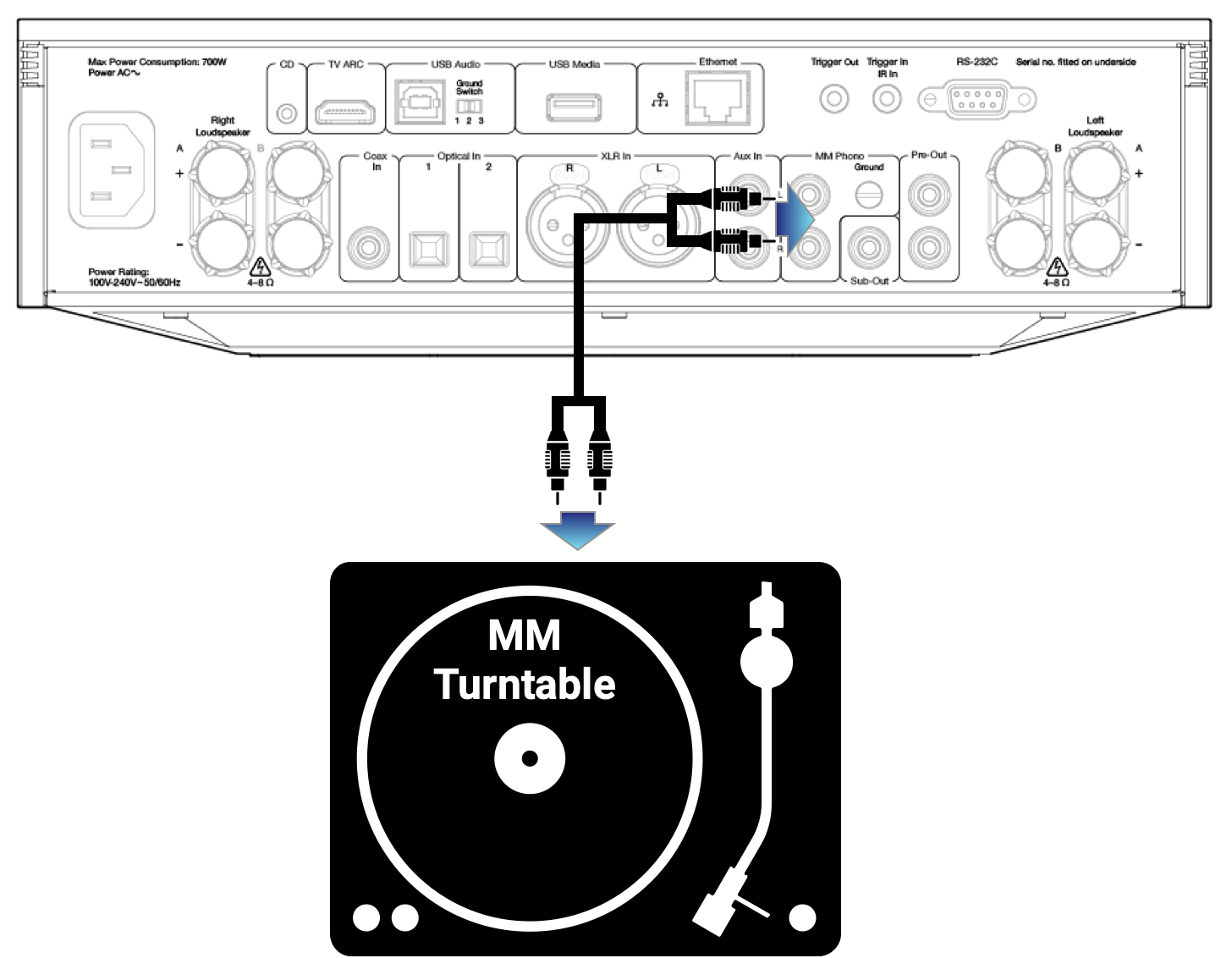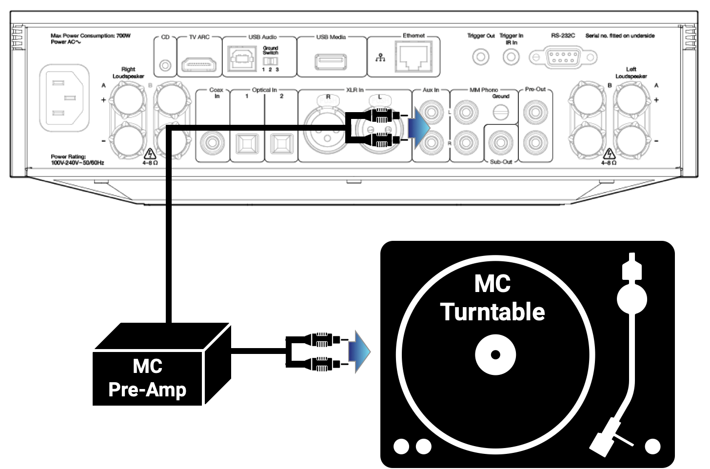 Using an RCA phono cable, connect the Turntable to a Moving Coil pre-amplifier. Using a second RCA phono cable, connect the Moving Coil pre-amplifier to the Auxiliary Input on your EVO unit.