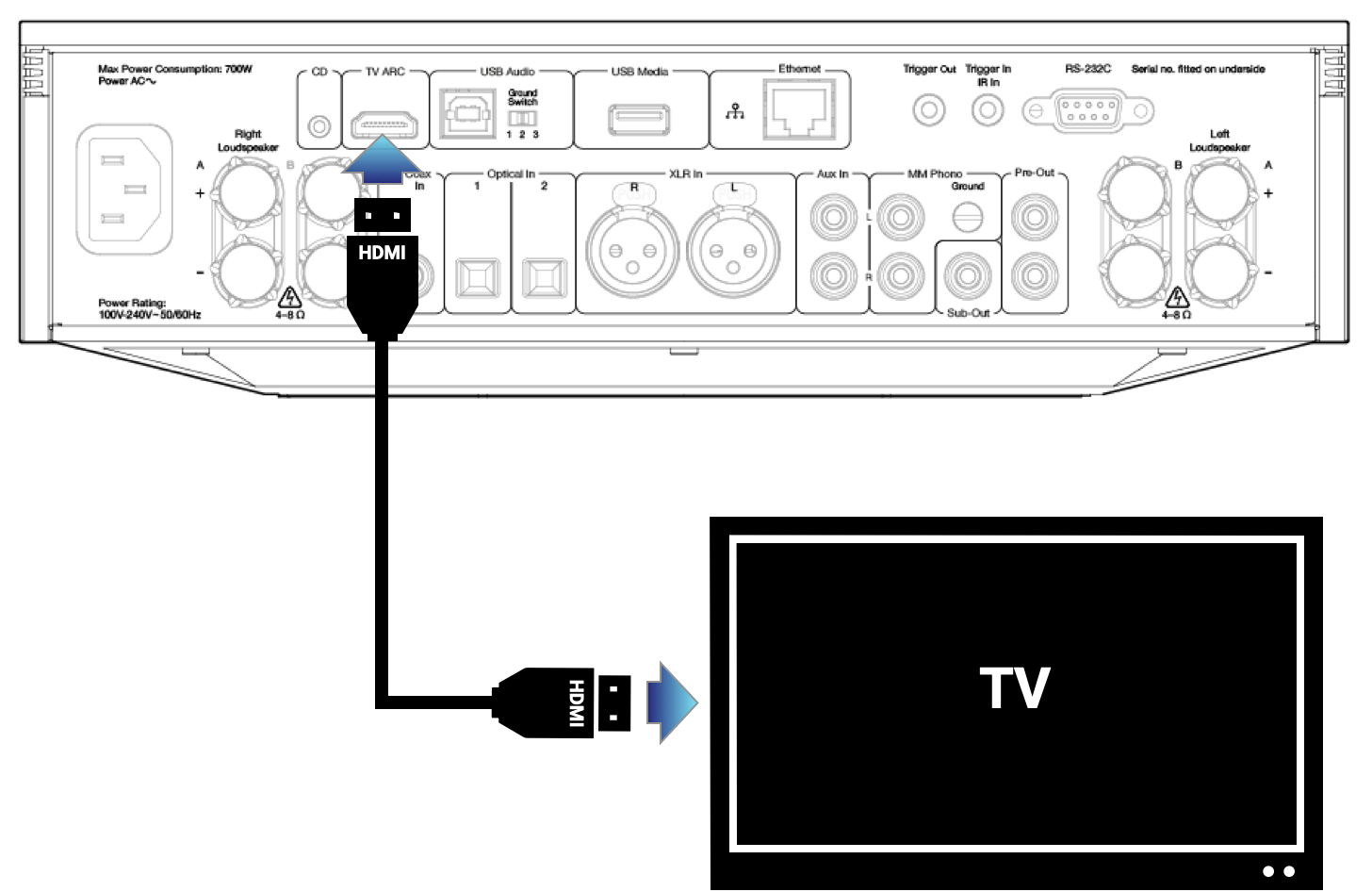 Using an HDMI cable, connect one end of the cable to the HDMI Output on your TV, and connect this to the TV ARC Input on your EVO unit.