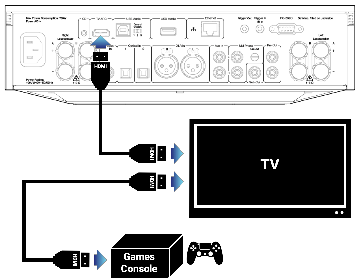 Using an HDMI cable connect the Games Console to the TV, and then using a second HDMI cable, connect one end of the cable to the HDMI Output on the TV, and connect this to the TV ARC Input on your EVO unit.