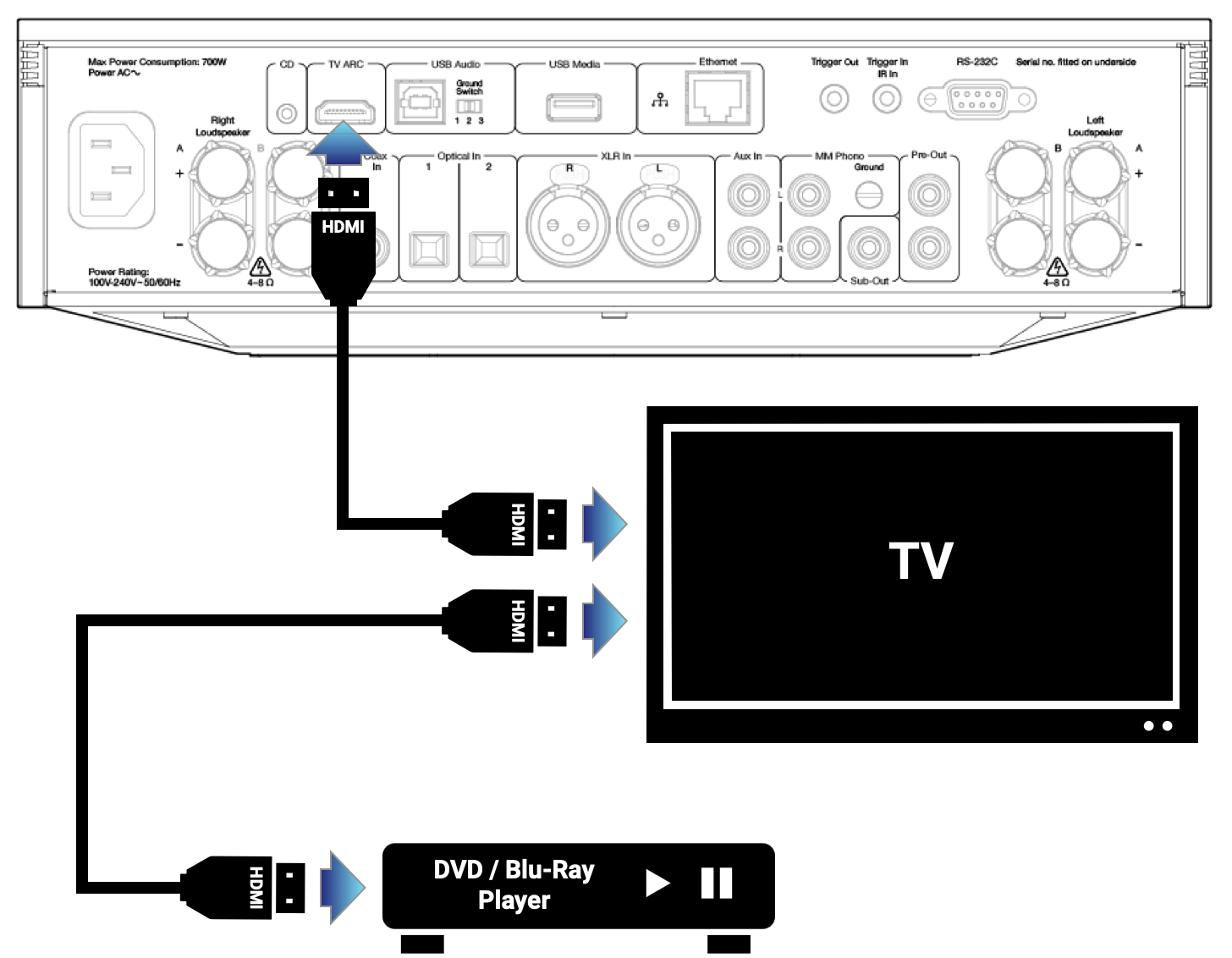 Using a HDMI cable connect the DVD or Blu-Ray Player to the TV, and then using a second HDMI cable, connect one end of the cable to the HDMI Output on the TV, and connect this to the TV ARC Input on your EVO unit.