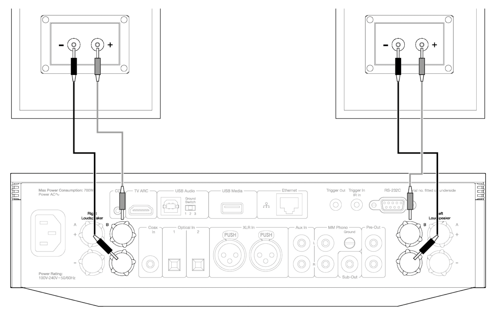 The diagram shows the connection for a second pair of loudspeakers. Pressing the speaker output icon will scroll through the selection of speakers, speaker A, speaker B, and speaker A and B together.