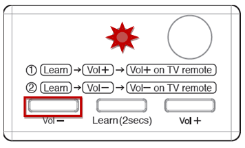 Point your Television or Satellite box’s remote at the TV5 and hold the corresponding Vol - button on your Television/Satellite box’s remote (central indicator light will turn white/green). This will complete the process for the Vol - function.