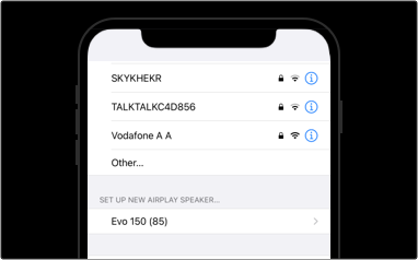 This process will use Apple's WAC setup process. You can find this by going to your iOS WiFi settings page and scrolling down. If the player is in Network Setup Mode it will be listed under the 'Set up a new AirPlay speaker' section.