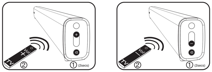 - Press and hold the button on the right side of the TVB2 for 2 seconds. "LEARN" and "VOL -" will flash on the display.