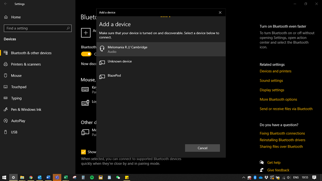 You will see either Melomania 1/1+ L or Melomania 1/1+ R in the Add a device list. Ensure that the Melomania 1/1+ (L or R) has the headset icon next to it in the Add a device list. If you do not see the headset icon next to Melomania 1/1+ (L or R), press Cancel and try again.