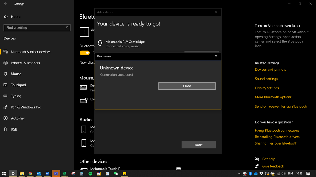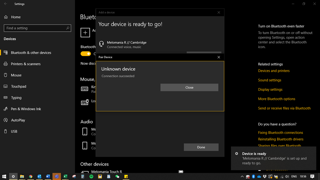 Once selected you will hear the “Melomania Connected” voice prompt. Stay on this page. You will also see the pop-up box in the bottom right of the screen informing you about ‘Setting up device’. This is your primary earphone.