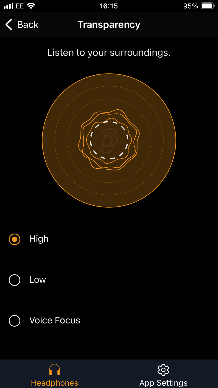 You will also be able to change the level of Transparency in the Melomania Connect App by selecting ‘Transparency’, where you’ll be able to choose from one of the following Transparency modes: Voice Focus, High and Low.