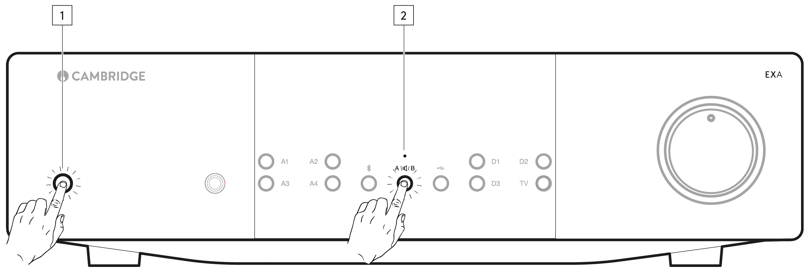 2. Whilst in Standby mode, press and hold the Speaker A/B button until the A/B lights flash alternatively and the sources A1-A4 and the TV input LED light up.