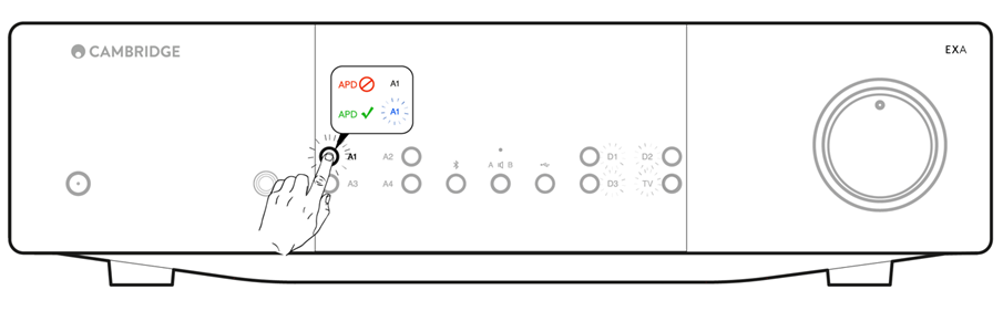- Enter the setup menu - Whilst the EXA100 is in standby mode, press and hold speaker A/B button until speaker A/B white LED’s flash alternately, then release speaker A/B button.