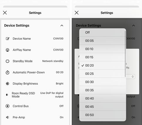 The EXN100 will automatically switch to standby mode after 20 minutes of inactivity. This Automatic Power-Down (APD) feature can be disabled, by navigating to the device settings within the StreamMagic app.
